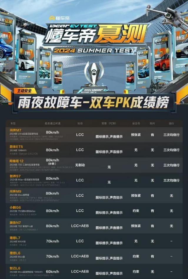 结果显示,在60、70、80km/h的三次测试中,问界M9和问界新M7 Ultra都展现出碾压式成绩,都能在进入雨区后,自动降低速度,并早早识别故障车辆,缓缓刹停。其中,在80km/h的测试条件下,问界新M7 Ultra LCC不仅具备双闪警示功能,还有安全带预紧功能,通过灵活的绕行操作,成功避免了与假车的碰撞。