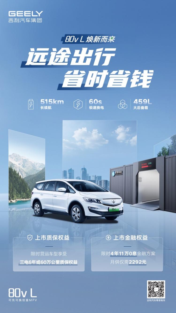 新能源智慧出行时代,以空间优势见长的MPV带给用户多元化、个性化、智能化的出行体验,市场热度持续攀升。作为吉利汽车集团面向出行市场倾力打造的“可充可换创富MPV”,吉利80v L不仅兼具长续航、大空间、高安全等优势,更以可换可充打破用户补能焦虑,在提升运营效率的同时兼顾经济成本,实现用车便利性和场景化双提升。既能做网约车,又可做城际客运,吉利80v L打造集高效、耐跑、舒适的多场景商旅营运座驾,引领智慧出行体验再升级。