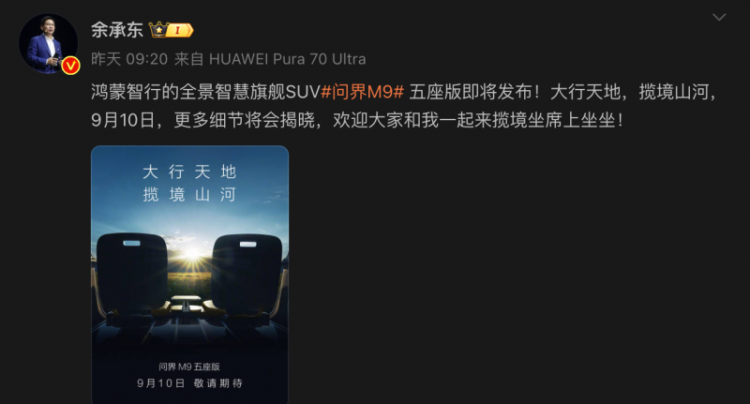 最后还有一则好消息,9月10日,问界M9五座版将正式上市,与现有的六座版相比,将取消第三排座椅,进一步扩大空间利用优势。至于还有哪些看点,一起关注发布会吧!