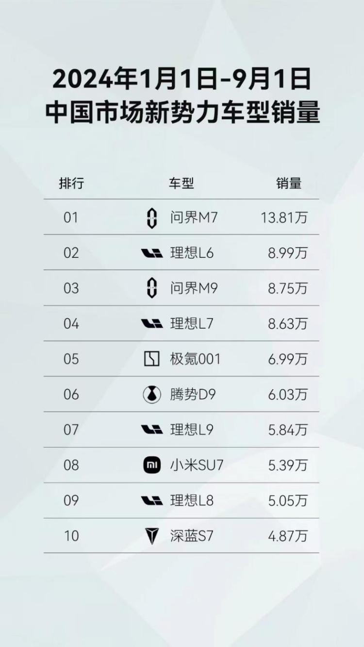 而且从市场来看,目前问界M9的对手理想L9只有6座版本,问界M9率先新增五座版本可谓是抢占了先机,竞争力也会进一步提升,再加上问界M9提供了纯电和增程式两个版本可以选择,相比之下更加的丰富,对于消费者来说选择也更多样化。从目前的市场销量表现来看,在近期公布的2024年1月1日-9月1日中国市场新势力车型销量排行榜中,问界M9以8.75万台的销量位列榜单第三名,榜单冠军为问界M7,销量达到了13.81万辆,足见问界品牌产品的超强竞争力。