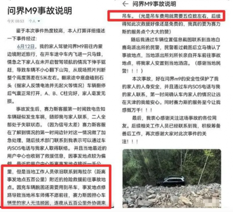 另一位问界M9的用户于西藏自驾旅行时,在海拔4000多米的高原地区遭遇爆胎,地处荒凉且环境恶劣的高原,面对突如其来的困境,非常无助焦虑。但是在拨通救援热线后,工作人员往返数百公里为其递送备胎,及时解决了燃眉之急。等待救援的过程中,问界也给予了用户无微不至的关怀。由于用户地处偏远,已有几个小时的时间未进食,奔赴现场的工作人员还自发准备饭菜,为他们带去了温暖。