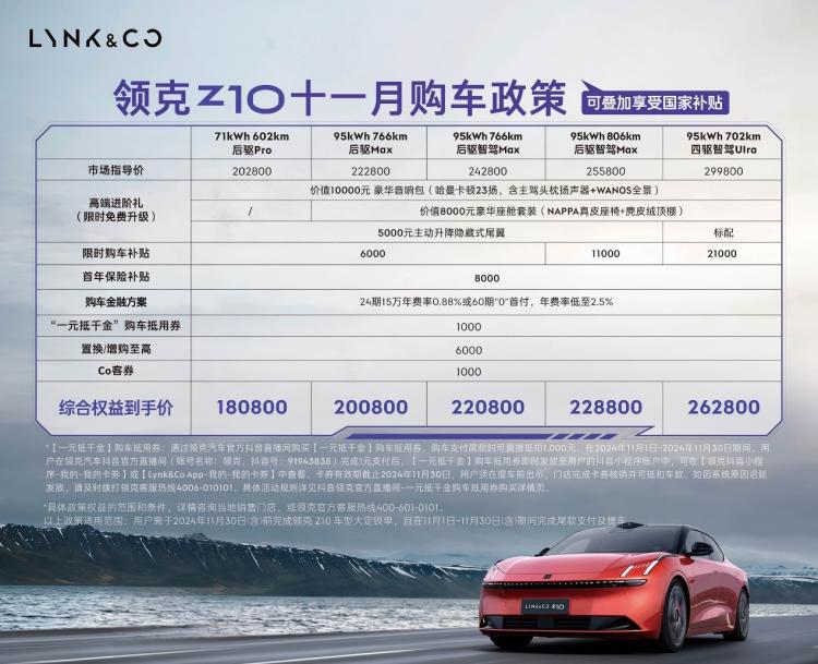 11月1日-11月30日期间,领克Z10还面向用户推出限时至高享60,000元购车权益。11月30日(含)前完成领克Z10车型大定锁单,且在11月1日-11月30日(含)期间完成尾款支付及提车的用户,仅需18.08万元起就能将领克Z10带回家,购车无负担,用车无压力,轻松拥抱高端纯电出行。