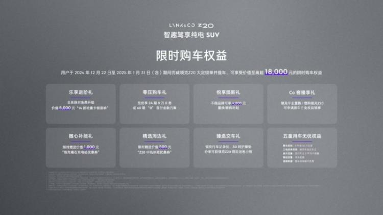 为回馈广大用户支持,领克Z20推出多重购车权益,在 2024年 12月22日至2025年1月31日(含)期间完成领克Z20 大定锁单并提车,可享受价值至高超18,0OO元的限时购车权益。