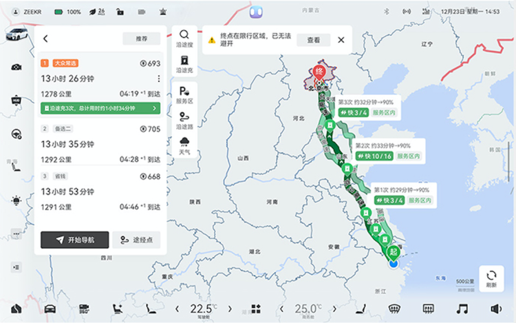 除此之外,极氪009 &极氪009光辉的ZEEKR OTA 6.3升级在导航功能方面进行了多项优化,让用户的出行体验更加便捷和安心。系统新增的异常天气提醒功能,在导航过程中实时监测前方的天气异常情况,提醒用户有效规避恶劣天气。自动加电路线规划功能同样值得关注,当电量无法到达目的地时,系统会智能规划充电路线,明确告知用户需要充几次电、在哪里充电,彻底告别里程焦虑,让用户的出行更加从容安心。