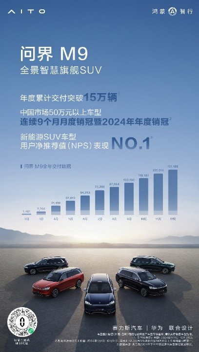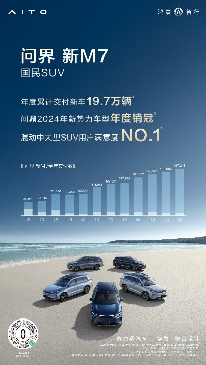 产品力拉满的问界车型已经成为越来越多用户的选择,问界M9自发布以来,12个月累计大定订单已突破20万辆,连续9个月蝉联中国市场50万元以上车型月度销冠,并荣获2024年该细分市场年度销冠,树立了科技豪华领域的新标杆。问界新M7系列12月交付14150辆,年度累计交付新车19.7万辆,荣获2024年新势力车型年度销冠。近期,杰兰路2024年度下半年新能源汽车品牌健康度研究公布,问界在“净推荐值NPS”“发展信心指数”等方面均取得了第一的好成绩,其中在净推荐值NPS方面,问界拔得头筹,NPS高达82.0,问界M9、问界M7分别获新能源SUV车型净推荐值第一、第三,足见问界在用户中的口碑及好感度。