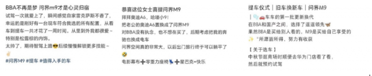 观察问界M9的车主不难发现,他们大多属于高净值人群,以增换购需求为主,很多人来自BBAP等传统豪华品牌,优点是他们愿意为好产品支付溢价,但缺点也显而易见,他们十分懂车、挑剔,难以被说服。但对于问界M9,他们这样评价:“BBA是买给别人看的,问界M9是买给自己享受的”“BBA和问界M9不是一个时代的产物,就像用智能机习惯了,谁还想用老年机”“油车开一段时间,新鲜感就过了,舒适智能方面没什么亮点,而问界M9‘旦用难回’”。