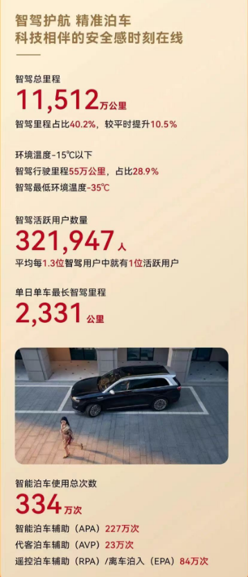 数据是最好的证明,问界官方公布的2025年问界汽车春节出行报告显示,问界车主总行驶里程达37,302万公里,其中智驾总里程达11,512万公里,占比40.2%,智驾活跃用户数量达321,947人,智能泊车使用总次数大334万次。截至最新数据,问界智驾总里程达15.6亿公里,AEB累计触发136.9万次。问界真的在加速推动智驾功能的普及程度,让越来越多的人从“不敢开”转变为“敢开、想开、爱开”。