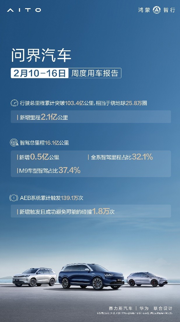 得益于领先一代的智驾技术,问界智驾用户超41万,智驾总里程高达16.1亿公里,在智驾商用实践方面持续领先。此外,问界AEB系统累计触发139.1万次,将主动安全做到极致。可以说,问界是当之无愧的全民智驾的践行者及引领者。