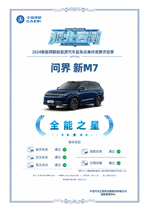 凭借领先的智能体验、硬核的安全配置和舒适的乘坐空间,问界新M7不仅成为2024年新能源车市的现象级爆款,更赢得了行业的高度认可。近期,问界新M7就先后荣获中国汽研“2024年极北寒测全能之星”、新能源SUV车型净推荐值第三等权威认证,充分证明科技豪华的产品实力。