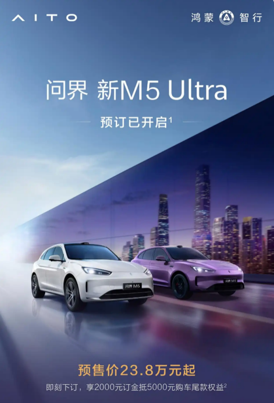 现问界新M5 Ultra开放预订中,预售价23.8万元起,预订即可享2000元订金抵5000元购车尾款的权益。随着五大产品力升级,问界新M5 Ultra将以更加智慧与优雅的姿态,陪伴都市女性探索生活的无限可能,共同书写“她时代”的精彩篇章。