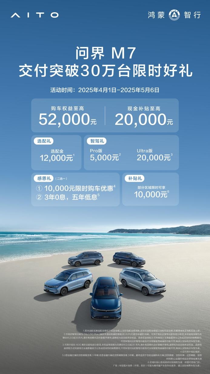 为庆祝突破30万辆交付,官方限时推出多重购车好礼,即刻下定问界新M7至高可享价值52000元限时购车权益,其中现金补贴至高20000元,部分区域可享价值10000元限时购车补贴,以更优惠的价格享受新豪华出行体验!