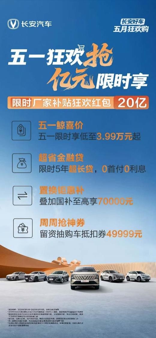 当500Bar超高压直喷新蓝鲸发动机引领燃油车进入“一箱油1000公里时代”的同时,长安汽车也始终不忘加深与用户的情感连接。进入5月,为回馈用户支持,长安汽车更发起了“五一狂欢抢、亿元限时享”活动,即日起至5月11日,消费者购车可享限时现金直降、高额置换补贴、超值保养礼包等权益,狂欢红包20亿,助力用户轻松购车!