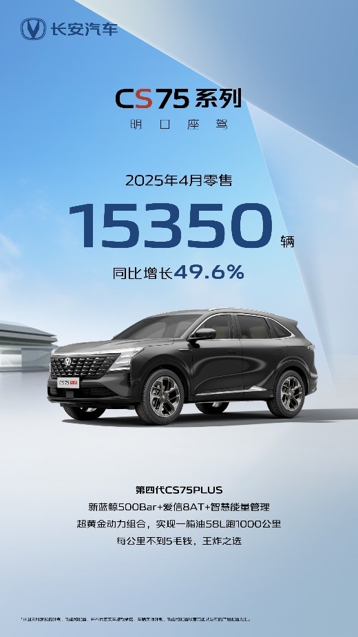 4月,长安CS75系列交出了月销1.54万辆,同比大涨49.6%的销量表现,依旧占据2025年的SUV燃油车市场销量前列!