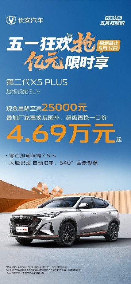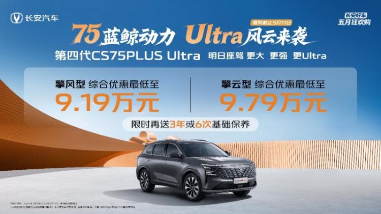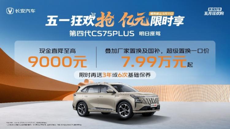 此次“五一狂欢抢、亿元限时享”活动期间,用户下订第四代CS75PLUS系列,不仅限时送3年或6次基础保养,更有至高15000元国补、1599元享8888元终身基础保养、基础流量终身免费及娱乐流量3年免费、0首付/5年低息超长贷等福利。下订第四代CS75PLUS,更有限时至高9000元现金优惠、叠加10000元厂家置换补贴,到手价仅需7.99万元起!下订第四代CS75PLUS Ultra,立享至高12000元现金优惠及15000元全品牌置换补贴,到手价仅需9.19万元起!