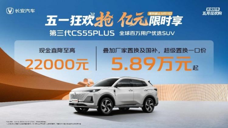活动期间,在至高6000元置换补贴、1599元享价值8888元终身基础保养(首任车主)、基础流量终身免费及增值流量3年免费(2G/月)、8万60期超长贷等多项福利基础上,用户下订第三代CS55PLUS,可立享现金直降22000元,叠加15000元国补后,超级置换一口价仅需5.89万元起!
