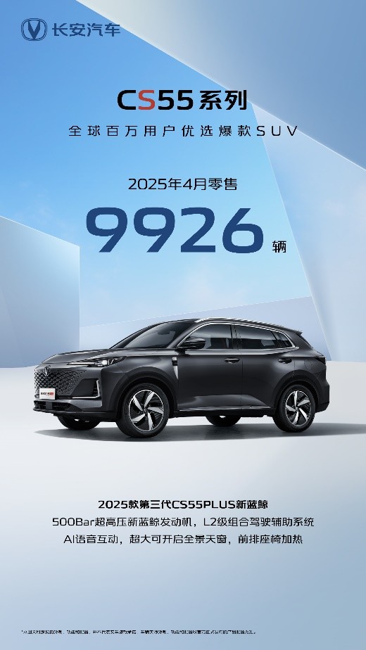 长安CS55系列在4月迎来了搭载新蓝鲸500Bar超高压直喷新蓝鲸发动机的2025款第三代CS55PLUS,产品势能的提升,让长安CS55系列在4月交出了单月销售9926辆的市场成绩。上市累计销量超过100万辆的“全球百万用户优选爆款SUV”,在2025年的SUV市场中,依旧保持着领先的竞争力。