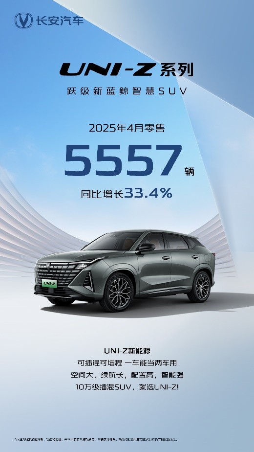 4月,长安UNI-Z系列交出5557辆、同比增长33.4%的销量数据。凭借动力领先、空间更大、配置更优等优势,“汽车机器人”正在成为越来越多用户的优中之选。