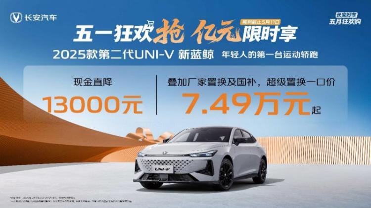 针对轿跑用户,在此次“五一狂欢抢、亿元限时享”活动期间,长安汽车针对UNI-V全系车型均推出了优惠政策,以2025款第二代UNI-V新蓝鲸为例,用户下订不仅立享13000元现金优惠,还有厂家补贴至高6000元、至高15000元国补、1599元享价值8888元终身基础保养(首任车主)、基础流量终身免费及增值流量3年免费(4G/月)、8万60期低息等福利,仅需7.49万元起的到手价,就能轻松拥有这辆集“最强动力、最安全车身、超高智能”等优点于一身的“最炫轿跑”!