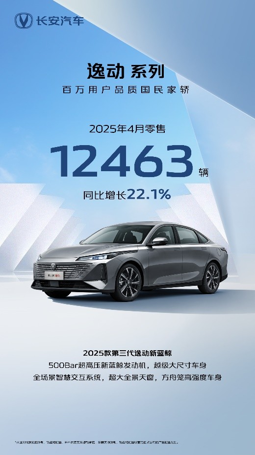 轿车市场,“国民家轿”长安逸动系列在4月同样迎来了产品焕新,搭载500Bar超高压直喷新蓝鲸发动机的2025款第三代逸动一经上市,就凭借其超省、超⼤、超美、超智能、超安全的多重价值,得到了用户的热捧,并助推长安逸动系列在4月交出了1.25万辆、同比增长22.1%的市场成绩。