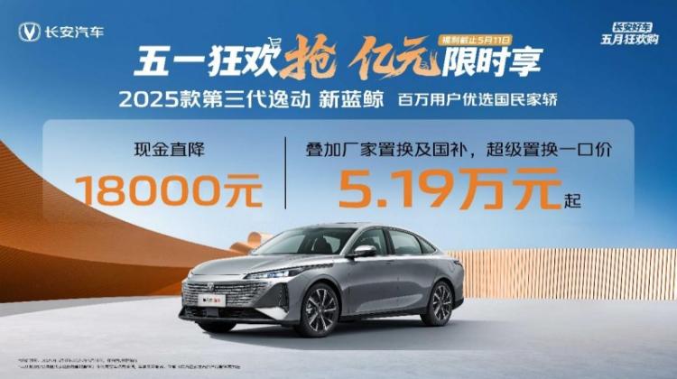 此次活动期间,长安汽车为了满足家轿用户的购车、换车需求,围绕长安逸动系列再度推出多项重磅福利。以2025款第三代逸动新蓝鲸为例,用户下订立享至高18000元现金优惠、3000元全品牌厂家置换补贴,叠加15000元国家补贴,到手价仅需5.19万元起!