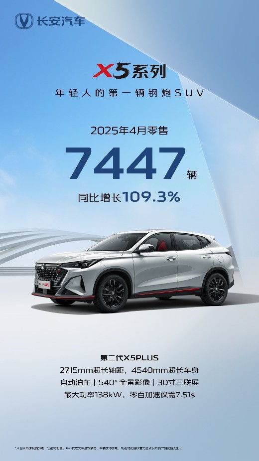 在设计和配置上紧贴中国年轻家庭需求的长安X5系列,凭借第二代X5PLUS的热销,在4月依旧保持着热销势头,单月销售7447辆。在2025年,“年轻人的第一台钢炮SUV”对年轻人的吸引力,可以说是丝毫不减。