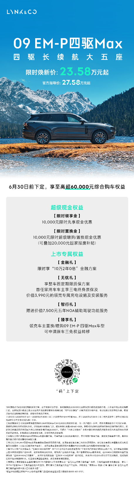 领克09 EM-P四驱Max大五座,不仅满足当代年轻用户对大五座插混SUV多样化出行的需求,更是送上六重福利。用户在6月30日前下定享至高超60000元综合购车权益,包括10000元限时领享金、10000元限时超级增购/置换现金优惠(可叠加20000元国家报废补贴)、“10万2年0息”限时金融方案、价值7500元五年NOA辅助驾驶功能服务、整车固定期限质保方案、首任家用车车主享三电终身质保及价值3990元的领克专属充电设施及安装服务。此外,领克车主置换/增购09 EM-P四驱Max车型可申请原车三免权益转移。多重福利加持,助力用户轻松拥有全场景自由出行体验。