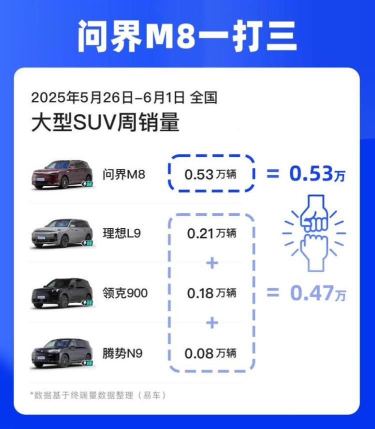 最新销量数据显示,在2025年5月26日至6月1日这一周,问界M8以5300辆的销量成绩,在中国乘用车40万级大型SUV细分市场独占鳌头。值得注意的是,这一数字甚至超过了理想L9、领克900和腾势N9三款热门车型的总和(4700辆),可见其受欢迎程度。