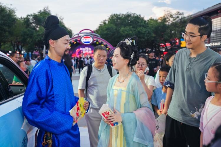 几天后,这场穿越之旅在西安迎来高潮。漫步大唐不夜城地屏广场,游客们手持通关文牒穿梭于仿唐建筑与现代光影交织的展台间。荔枝转运使李善德向众人抛出千古难题:”岭南荔枝三日味变,诸君可有妙计?”当观众献策”冰鉴储鲜”时,他朗声大笑指向长安展车:”若得新蓝鲸冷链技术相助,何止三日?十日鲜荔亦成!”这样的古今对话,恰是长安汽车用科技重写历史的生动注脚。