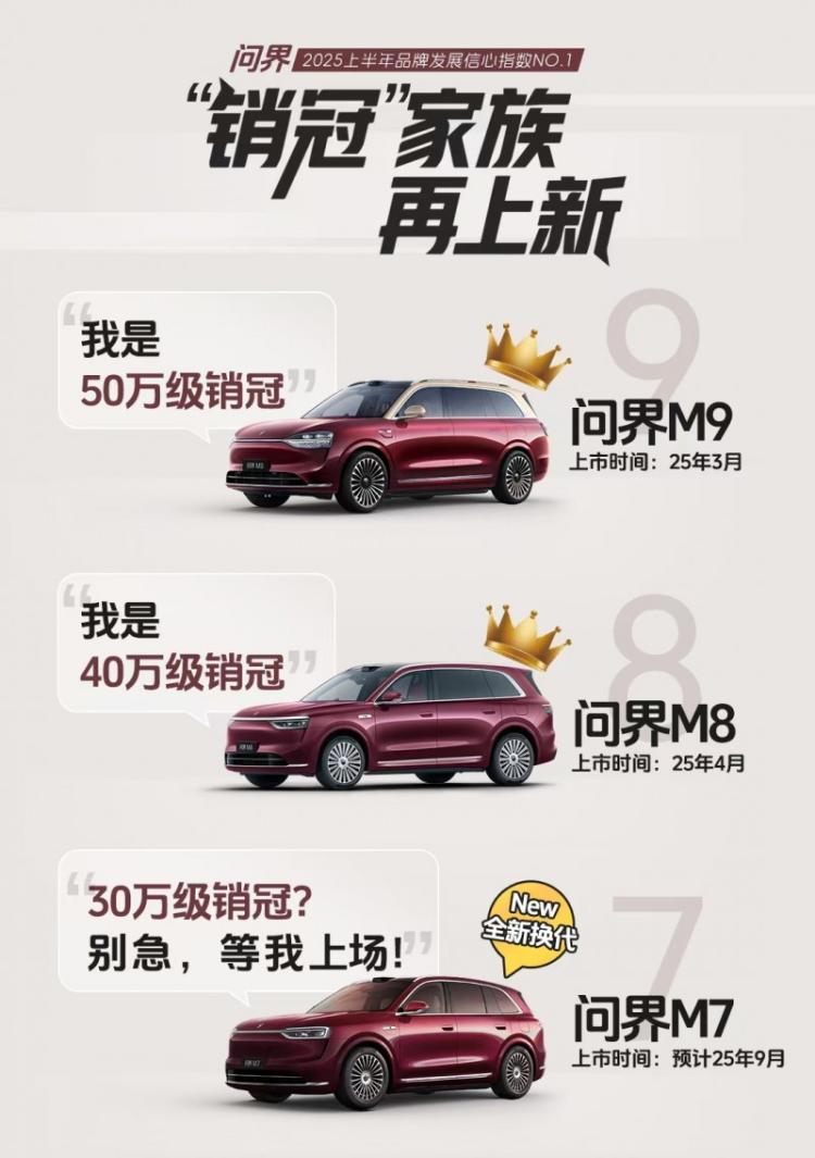 秉持“智慧重塑豪华”的理念,问界已为超过70万用户提供高端智能电动汽车产品,重塑了中国豪华车市场格局。其中,“全景智慧旗舰SUV”问界M9自上市以来,累计交付超过20万辆,稳居50万元级市场销量冠军;“家庭智慧旗舰SUV”问界M8上市至今累计交付超6万辆,领衔40万级市场。