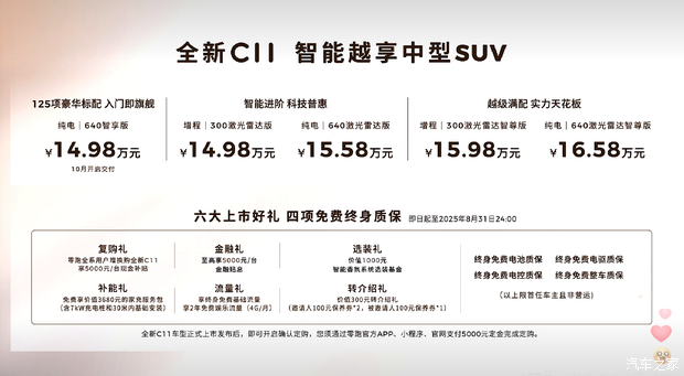 [本站 新车上市] 7月10日,新款零跑C11正式上市,新车共计推出5款车型,售价14.98-16.58万元。新款车型将实现全域800V架构,640km续航,配备激光雷达,实现端到端辅助驾驶,全系拥有前双叉臂后五连杆悬架和FSD悬架软硬调节,新车定位为一款中型SUV,包括增程和纯电车型。同时,官方在现场公布A、B、C、D四大系列产品矩阵以及各系列产品规划。关于新车详细售价及上市权益,见下图: