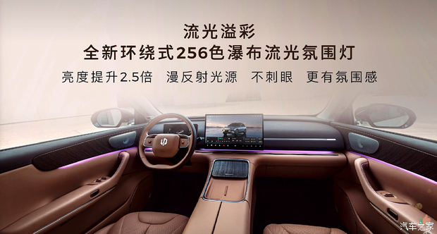 内饰方面,造型上反对堆砌,体验上多维度升级用户体验,新车采用全新的环抱式座舱设计,可以发现出风口改为隐藏式、两幅式方向盘按键更简洁化、取消副驾屏、隐藏式中置扬声器、覆盖式隐藏杯托。体验升级包括引入17.3英寸2.8K超高清中控屏、全景天幕、Nappa真皮可加热方向盘、256色氛围灯、中控下方尤加利木纹饰件、以及新增的智能香氛系统。新车内饰新增砂岩棕、浮光灰颜色。