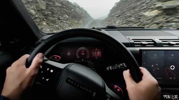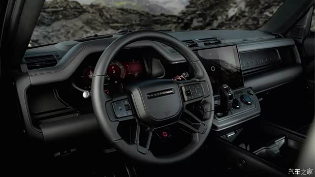 进入到车内,扑面而来的依旧是满眼黑色,包括中控台、方向盘,物理按键、座椅以及缝线等处全面黑化,并且还支持选装碳纤维饰件进行升级。在配置方面,新车将会搭载13.1英寸中控屏,与2026款路虎卫士保持一致。