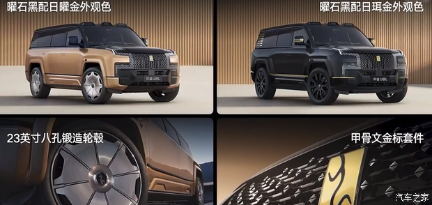 外观颜色方面,仰望U8L首发曜石黑配日曜金(大黑金)和曜石黑配日珥金(小黑金)两种配色,均为双色车身配色,更显尊贵。大黑金用的是6C3B的工艺,有着6层漆面,需要3次烘烤。