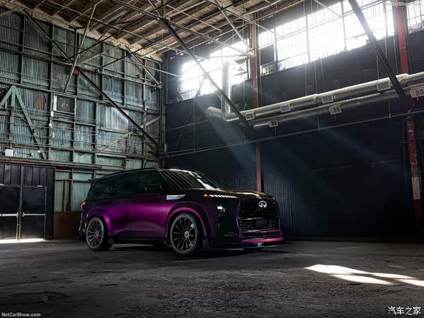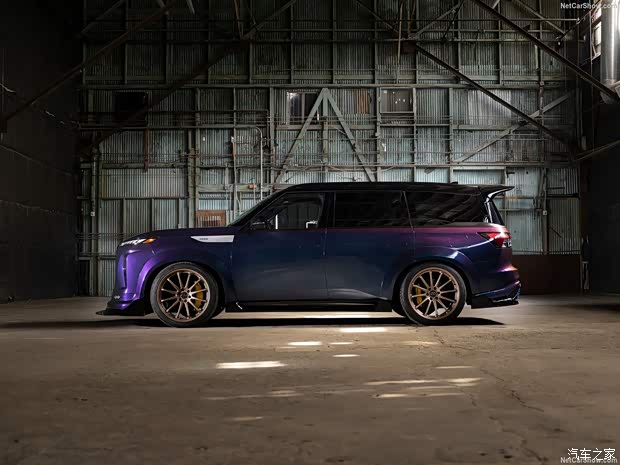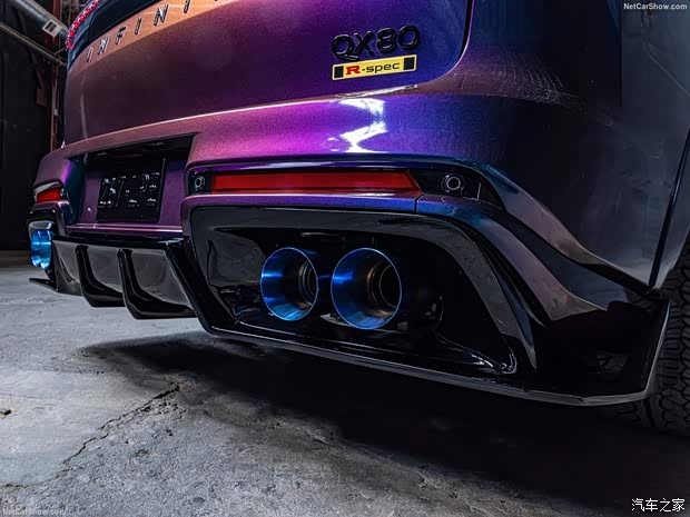 来看官图,新车在外观方面采用Midnight Purple(午夜紫)渐变色车漆进行涂装,该车漆也曾在R34、R35车型上使用。QX80 R-Spec概念车还使用了宽体套件以及更多的空气动力学设计,另外还换装短簧减振器打造出低趴效果。