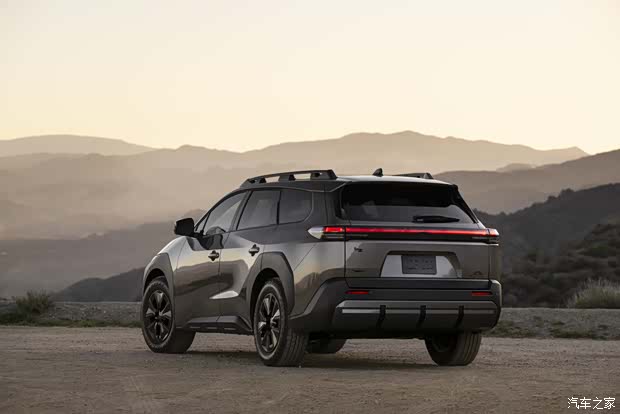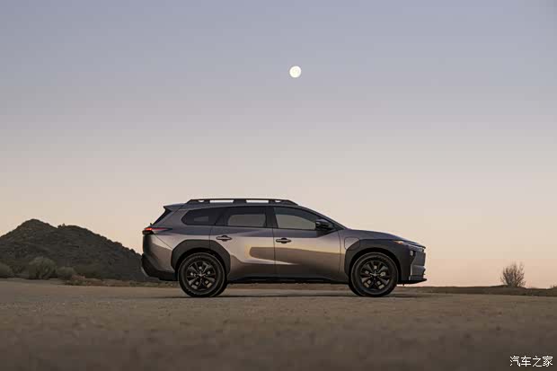 车身侧面来看,新车保留了此前bZ4X的“跨界”设计元素,前后次翼子板采用了与车身不同的黑色轮眉装饰,同时车顶上配备了旅行架,新车还配备了18英寸轮圈和全地形轮胎。