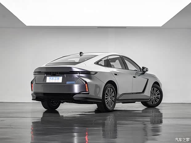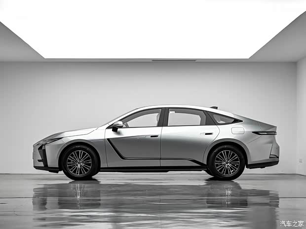 来到侧面,采用黑色饰条装饰的裙线十分抢眼,提升了车辆的运动感。另外其还采用隐藏式电子门把手以及溜背造型来提升空气动力学表现。据悉,其车身长度为5140mm,轴距为2950mm,另外混动版车型还会采用18英寸轮圈(纯电动版为21英寸),轮胎规格为235/60 R18。